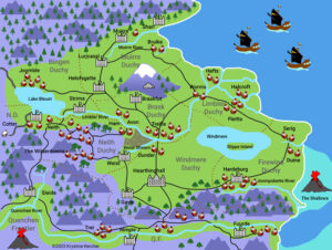 If you’ve been following my blog for a long time, you may remember me posting the benefits of creating a map of your fantasy land. Benefits include helping your reader visually picture your land, thus easing their comprehension as they read. If you haven’t read it, you can click on the following link, where I feature author Krystine Kercher’s map (pictured below).